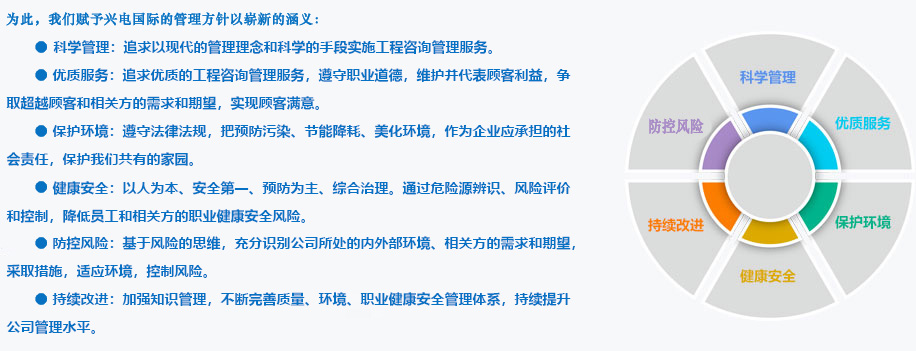 興電國(guó)際管理規(guī)范科學(xué)。質(zhì)量、環(huán)境、職業(yè)健康安全一體化管理體系已實(shí)施多年,工程咨詢管理服務(wù)各環(huán)節(jié)均有成熟的管理體系保證。興電國(guó)際的業(yè)務(wù)板塊各具特色、相互呼應(yīng),可以根據(jù)顧客的需求提供菜單式工程咨詢管理服務(wù),包括全過(guò)程或階段性專項(xiàng)服務(wù)、項(xiàng)目管理以及項(xiàng)目管理+專項(xiàng)服務(wù)等模式。